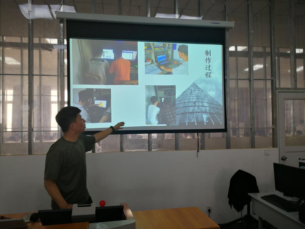 同学们分组使用PPT向在场的老师和同学展示了自己的设计作品,包括CAD二维绘图标注、三维实体建模、3D打印实物,Word设计制作说明文档等内容。武凤翔主任与王利卿副主任对同学们的设计作品做出一致好评,并发表讲话鼓励同学们继续努力。