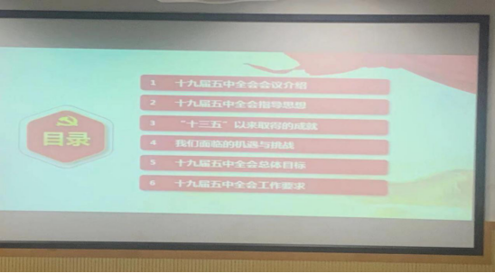 报告中,王远志紧紧围绕习近平总书记在党的十九届五中全会上的重要讲话精神和全会审议通过的《中共中央关于制定国民经济和社会发展第十四个五年规划和二〇三五年远景目标的建议》,从党的十九届五中全会的会议介绍、指导思想、“十三五”以来取得的成就、面临的机遇与挑战、党的十九届五中全会的总体目标和工作要求六个方面依次向我们讲述了党的十九届五中全会的具体内容。