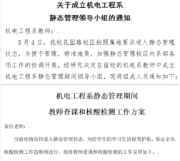 疫情发生当晚系主任王利卿同志接到信息立即返回学校开展工作部署,号召全系老师积极响应,快速行动,投入到疫情防控工作中去。5月4日,成立机电工程系静态管理领导小组,确保静态管理期间,教学及疫情防控等各项工作有序开展;优化教师巡课和师生核酸检测工作方案、疫情防控网格化管理方案,编排系疫情防控突击队值班表等,明确工作分工,加强团结协作。