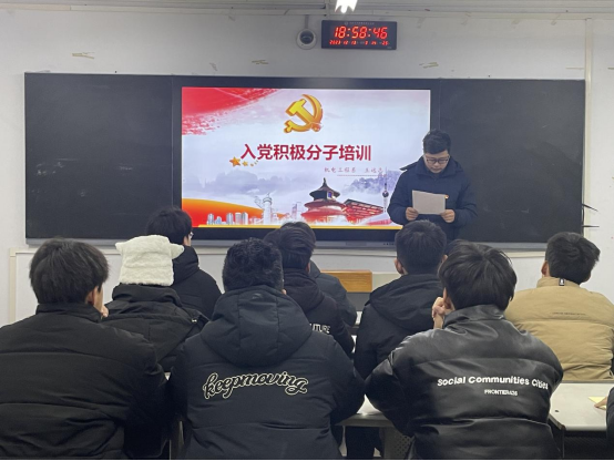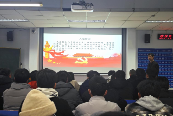 12月11日晚,机电工程系组织2023年第二期入党积极分子在南教205上党课。系党总支书记王建军以《学习党的知识,坚定理想信念》为题,从“政党”、“党的光辉历程”、“党的性质和宗旨”、“党的指导思想”、 “党的最高理想和现阶段奋斗目标”、“党的组织、纪律和作风”、“新时代大学生党员的要求”七个方面为入党积极分子进行讲解,为学员们呈现了一堂集知识性、哲理性、政治性为一体的党课。他勉励学员们笃行进取、遵纪守法、勤俭节约、正直自信,在积极向党组织靠拢的过程中不断增强自我净化、自我完善、自我革新、自我提高的意识和能力。