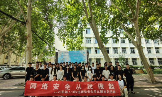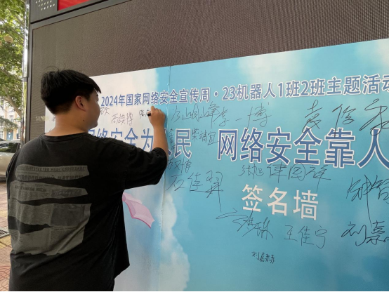 9月11日,23机器人1、2班在天使大道开展网络安全宣传周签名活动,师生纷纷驻足观看并郑重地在横幅上签下自己的名字,表达了对维护网络安全的坚定决心。一位参与签名的同学表示:“网络安全与我们每个人息息相关,通过这次签名活动,我更加深刻地认识到了网络安全的重要性,也学到了很多实用的网络安全知识。”