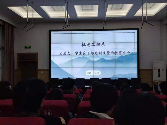 4月19日晚,机电工程系在北教三阶召开团学干部培训及警示教育大会,机电工程系团总支副书记叶佳豪主持会议,全体辅导员及团学干部出席会议。