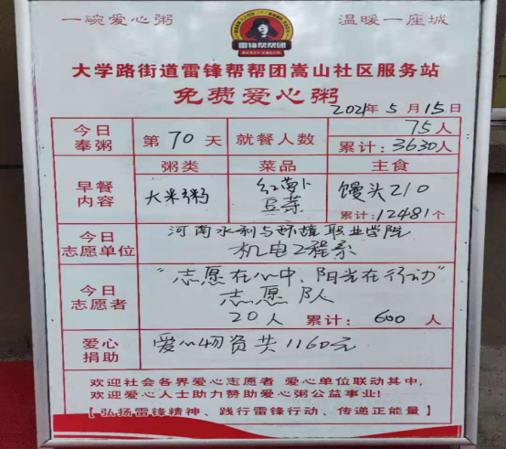 为了引导同学们践行初心使命,奋力担当作为,5月15日清晨,机电工程系组织青年志愿者们到大学路街道雷锋帮帮团嵩山社区服务站开展“爱心粥屋献爱心,志愿服务暖人心”社会志愿服务活动。