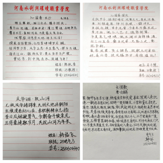 本次活动形式多样、内容丰富,共包含四个主题项目,吸引了全院众多学生的积极参与。在 “图”说中国海报设计大赛中,同学们围绕“丰碑、征程、未来”主题,用手中的画笔致敬英雄、展现国家辉煌成就、畅想民族复兴未来。“青春告白祖国,奋斗薪火相传”短视频征集活动则成为了同学们表达自我的舞台,他们自信地面对镜头,讲述自己与祖国的故事,展现了新时代青年昂扬向上的精神风貌。“笔”墨深情书法作品征集活动中,同学们挥毫泼墨,一幅幅或苍劲或娟秀的作品,书写着爱国诗词与对祖国的美好祝福。而在“红色人物猜猜看”趣味游戏现场,同学们在团队协作中重温红色记忆,深刻铭记了新时代青年的使命与担当。经过公正评选,活动最终评出一等奖5名、二等奖7名、三等奖9名。