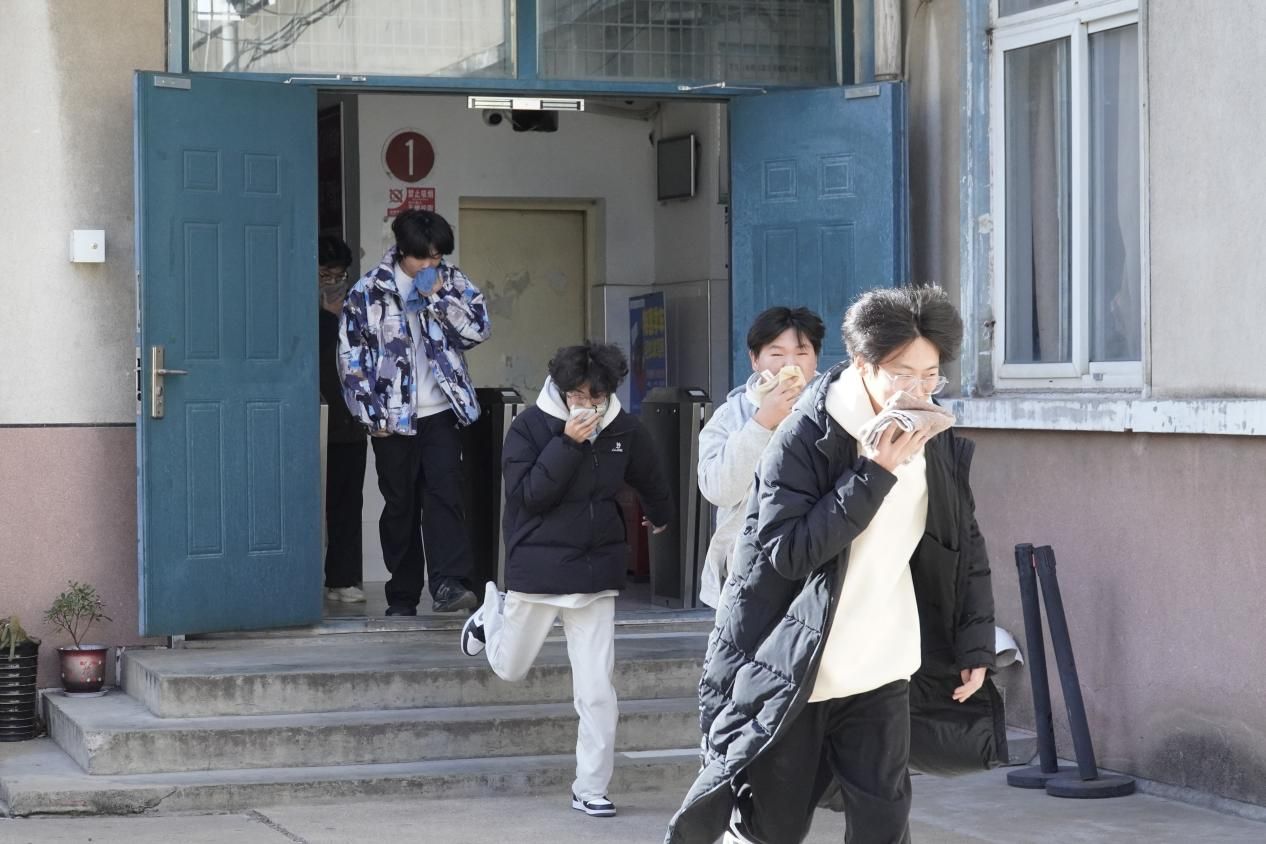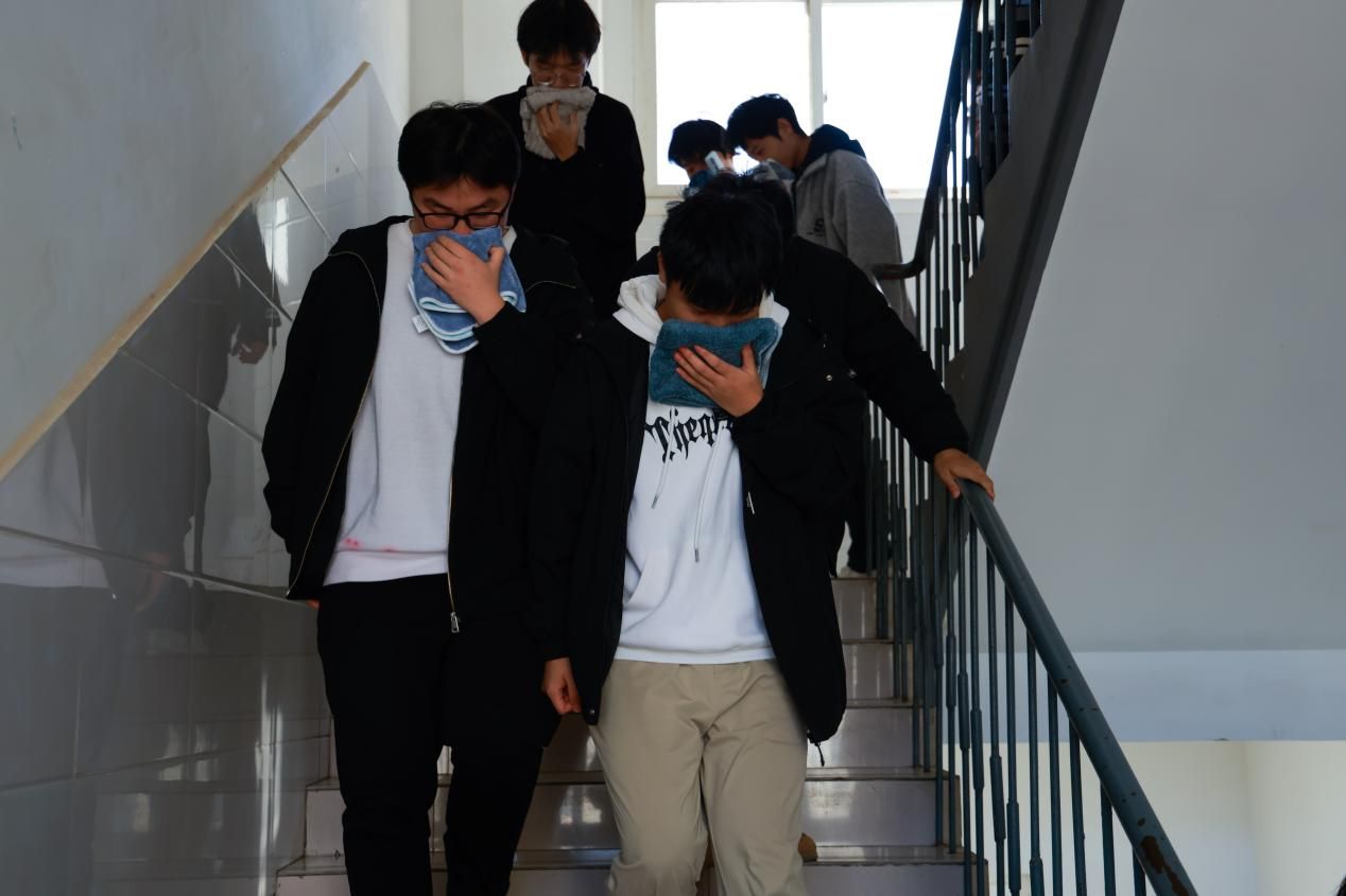 本次演练科目为宿舍突发火情人员疏散演练,活动共三项内容,包括模拟火灾场景人员疏散、火灾基本常识讲解、灭火器使用基本操作演示。随着急促的警报声响起,8号公寓楼突发火灾,接到火情报告后,值班老师迅速发出指令,立即启动处置突发事件应急预案,各辅导员迅速赶往火灾现场维持现场秩序,引导学生有序疏散。在疏散演练中,师生牢记“低头弯腰,掩住口鼻,快速有序”的逃生要领,整个疏散演练过程既紧张又有条不紊,在极短的时间内从宿舍公寓楼撤离到规定场所,统一集合并报备人数。