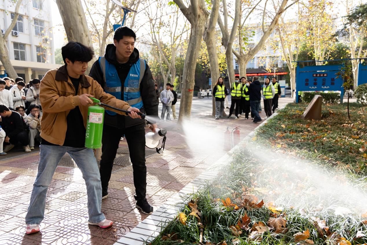 演练结束后,王远志提醒学生要严格遵守学校的消防安全规定,严禁在寝室内使用违规电器,同时要注意用电安全,避免超负荷用电和线路老化引发的火灾隐患。此外,寝室内要全面禁烟,烟头必须彻底熄灭后再丢弃。陈佳佳向师生们详细讲解了灭火器的使用方法和注意事项。在培训现场,通过实际操作演示,让师生们掌握了灭火器“一查、二拔、三瞄、四压”的基本操作步骤,即检查压力、拔掉保险销、瞄准火源根部、压下压把进行灭火。
